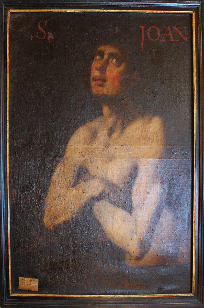 Half-length scene of Saint John the Baptist. Against a dark background, the saint',s naked torso is depicted in his youth. His arms are crossed over his chest and his eyes are looking heavenward, in a contemplative attitude. The most striking feature is the brightness and intensity with which his gaze is rendered. At the top, an inscription in red letters identifies the saint.