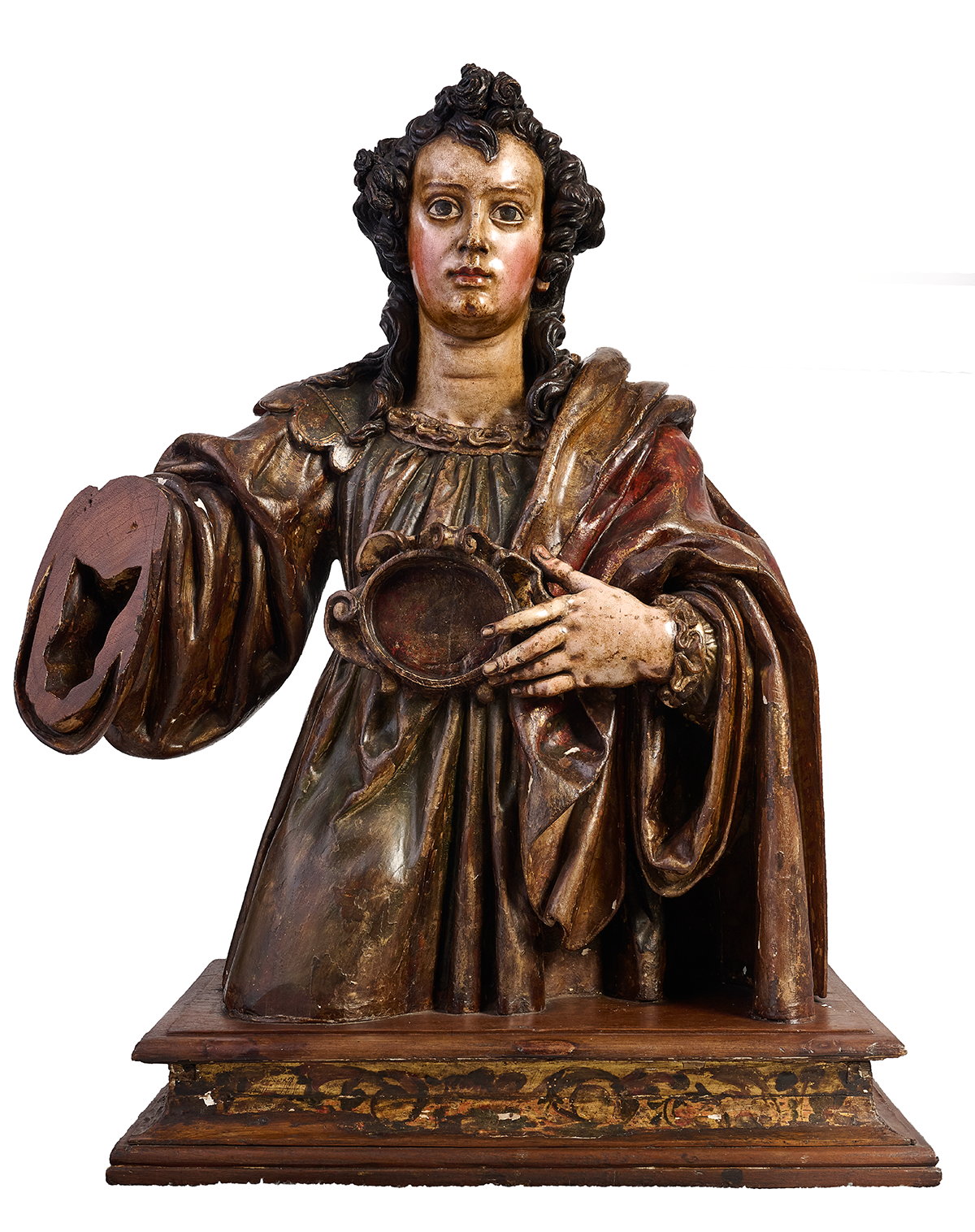 Half-length bust of a saint, who has been identified as Lucia, although also as Mary Magdalene. The lack of attributes depicted makes a confident identification difficult. She is sculpted frontally, with her gaze fixed on the horizon, giving her a hieratic air. The hair is noteworthy, with coiled curls that form protuberances on the forehead and over the ears, and fall in curls down the back, where they are gathered in a sophisticated bow. A characteristic feature, and one that relates this sculpture to the work of Juan de Mesa, is the treatment of the neck, with a double chin and a central cleft in the middle. A photograph preserved in the Olaso Dorrea archive shows the sculpture still with the currently missing hand (the right one). As can be seen, this hand held a cup. The currently preserved hand (the left one) holds the central niche that would house the relic.