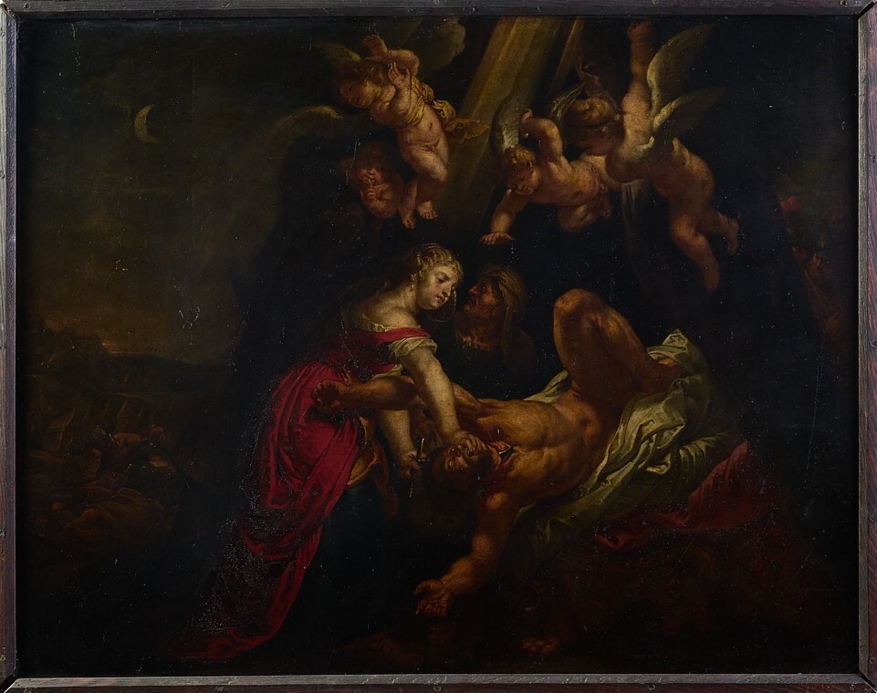 The scene depicts the beheading of the Assyrian general Holofernes by Judith, described in the book of her name (Judith 13:1-11). The action takes place at night. The heroine, dressed in a red tunic, cuts off Holofernes',s head with a knife, but he awakens only briefly from his intoxication due to the attack. His naked, muscular body writhes helplessly in a forced foreshortened position. Behind them, the servant girl gazes up at the waning moon. Above the three main figures, a group of four putti descends from the sky.