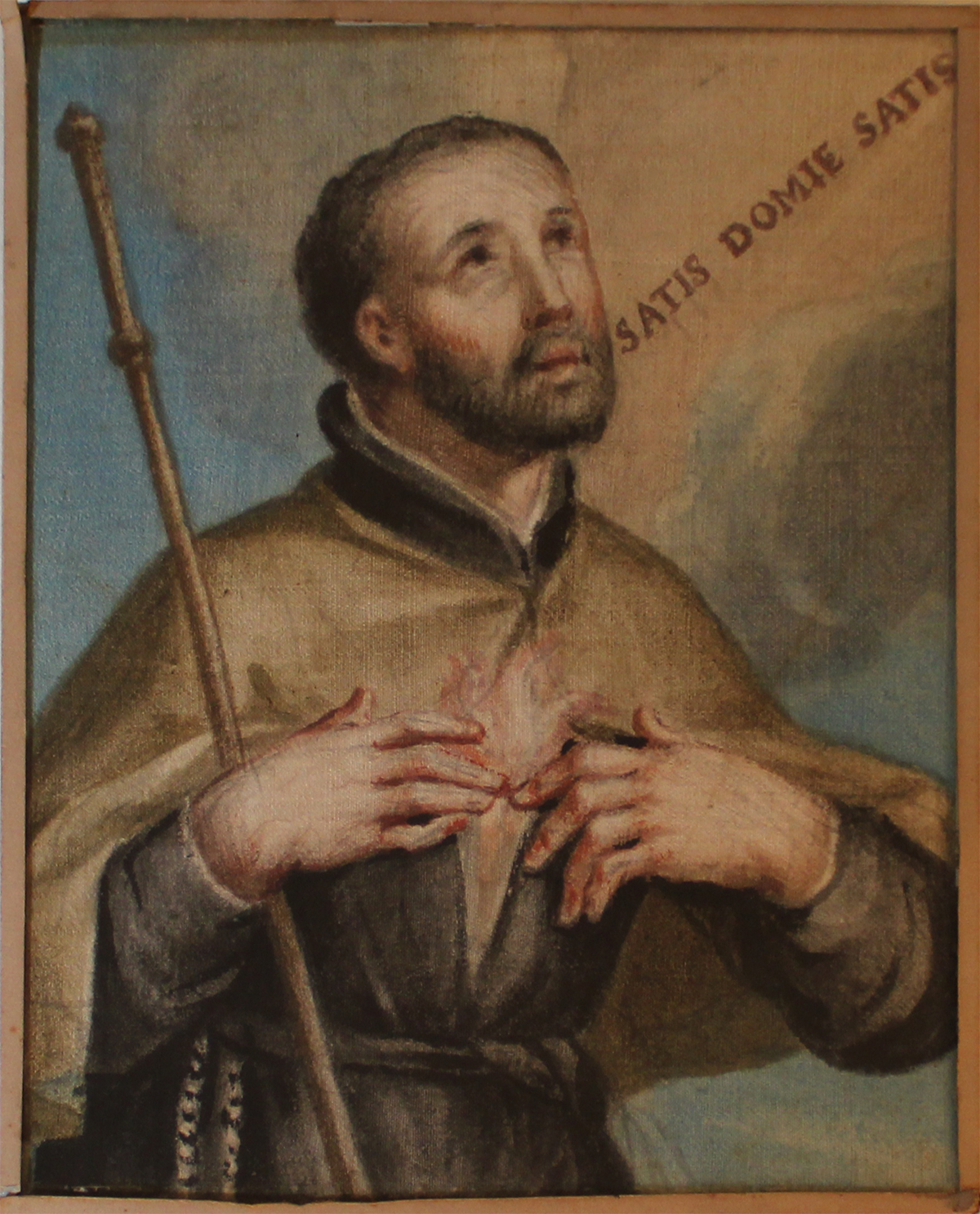 A common representation of Saint Francis Xavier, depicting the saint wearing the habit of the Jesuit order, carrying the cross and carrying the rosary. He raises his gaze to heaven while uttering the words "Satis, Domi(n)e, satis" (Enough, Lord, enough). This motto refers to the saint',s moments of ecstasy in Goa, India.