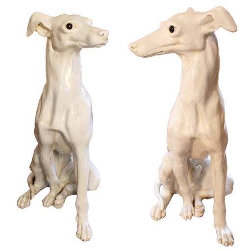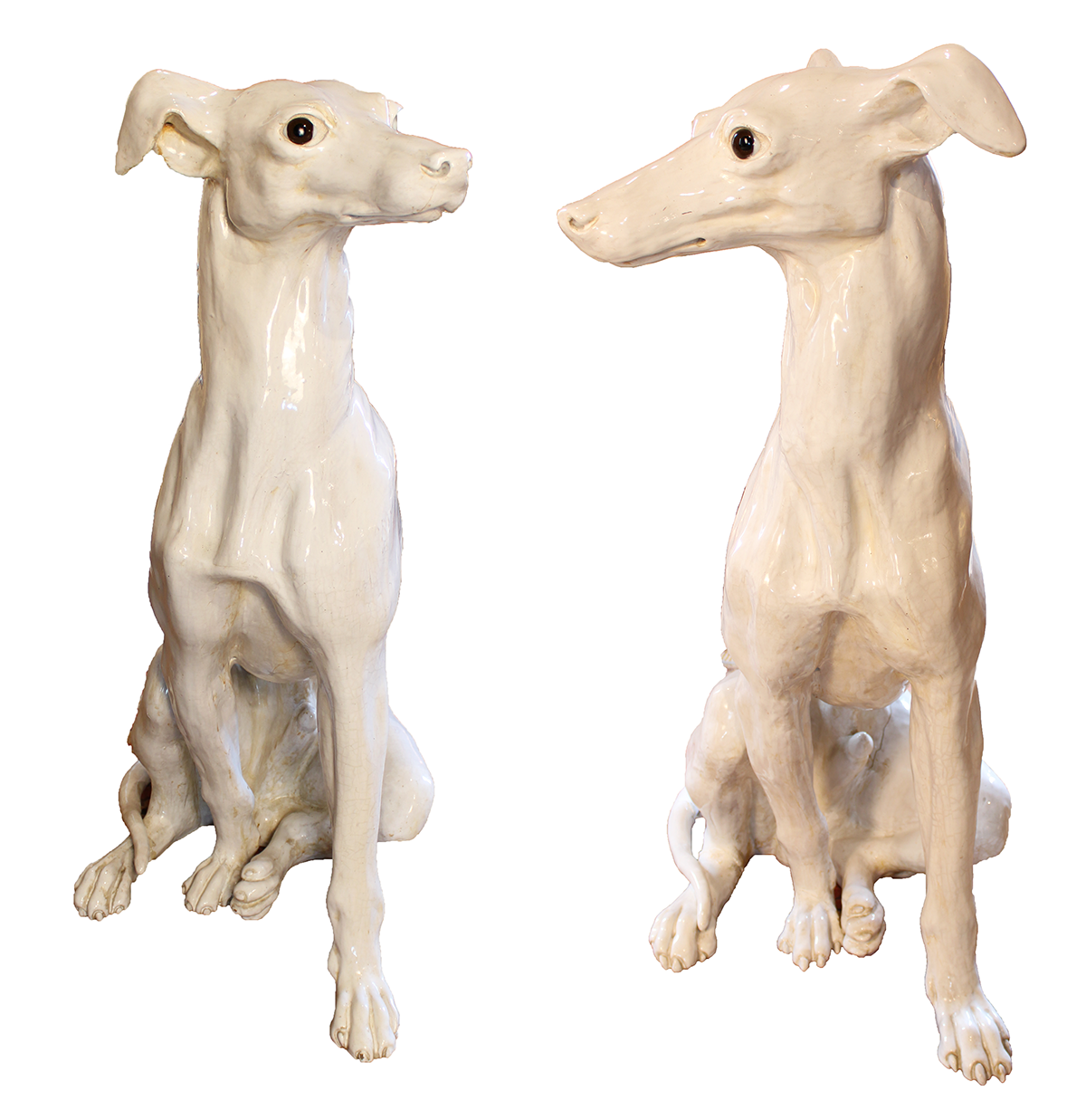 Pair of life-size decorative greyhounds made of white glazed ceramic.