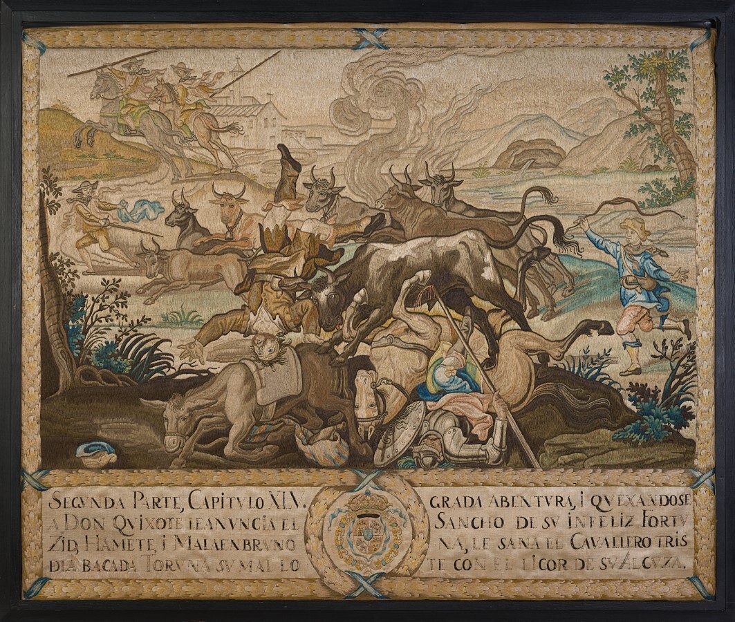 Description of the scene depicted in Chapter LVIII of the Second Part of the novel "Which deals with how so many adventures befell Don Quixote that they could not afford to wander one another" Against a rural background with hills, trees, a stream, and a church, the herd of wild bulls and steers, led by the foremen, runs over Quixote, Sancho, and their respective mounts, leaving them all battered. The action takes place mainly in the central section, where the figures of the protagonists---both human and animal---appear upside down as they are run over by the herd. The skill with which the foreshortenings are worked is striking. The scene is framed by a border adorned with blue ribbons. At the bottom, a text placed on either side of a shield with the royal arms describes what is happening in the image.