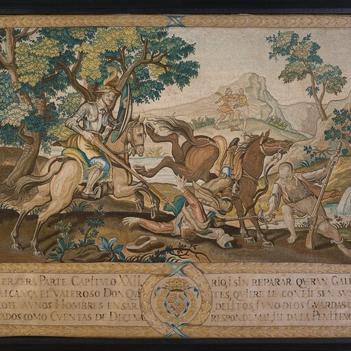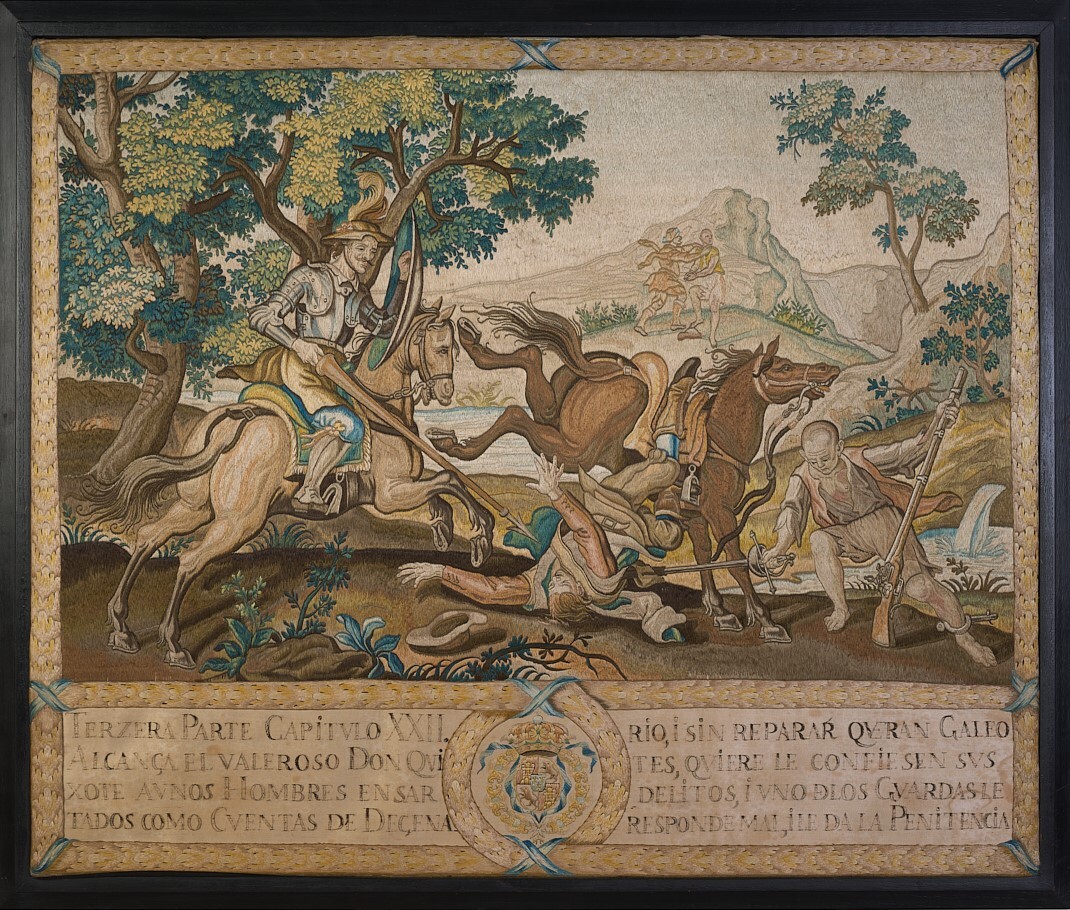 Although the reference to the corresponding chapter in this embroidery is not the same, the scene actually corresponds to Chapter XXII of the First Part of the novel: "Of the liberty that Don Quixote gave to many unfortunates who, against their will, were taken where they did not want to go." In a rural setting with a meadow, trees, and a mountainous backdrop, the scene captures the moment when Don Quixote manages to knock the guard leading the prisoners off his mount. One of them steals his weapons, seizing the moment, while the rest flee in the distance. The composition is very Baroque, highlighting the central figure of the guard who falls to the ground, in a forced foreshortening. The entire scene is framed by a border adorned with blue ribbons. At the base, a legend placed on each side of a shield with the arms of the Royal House explains to the viewer what is happening in the depicted image.