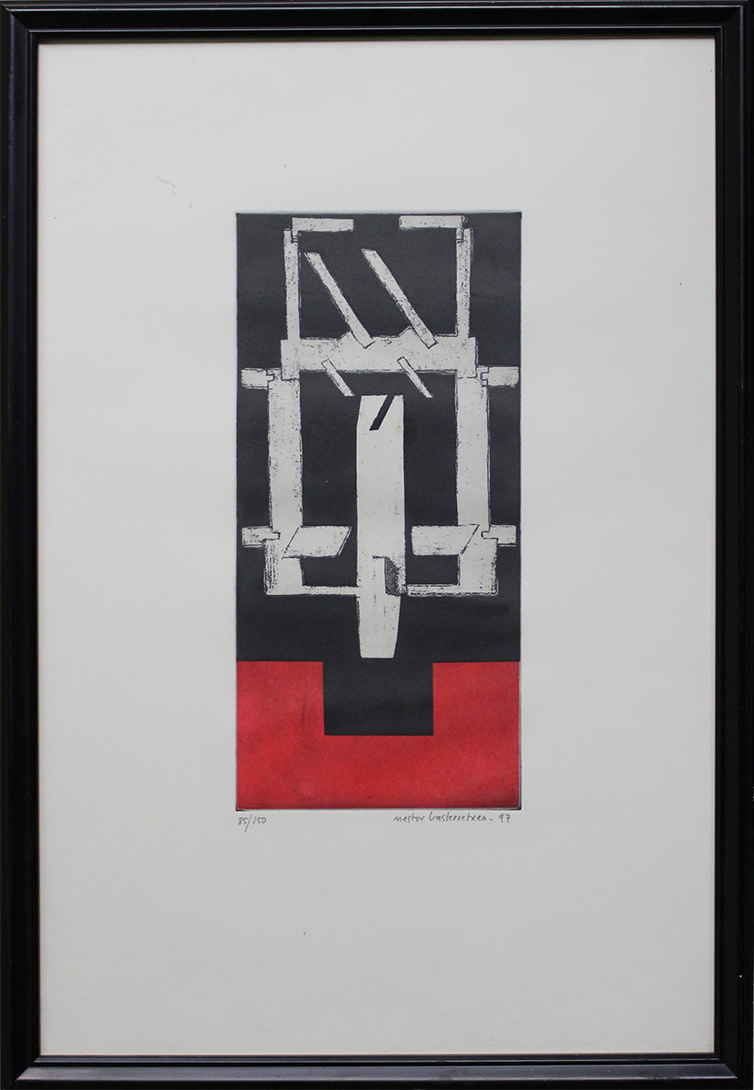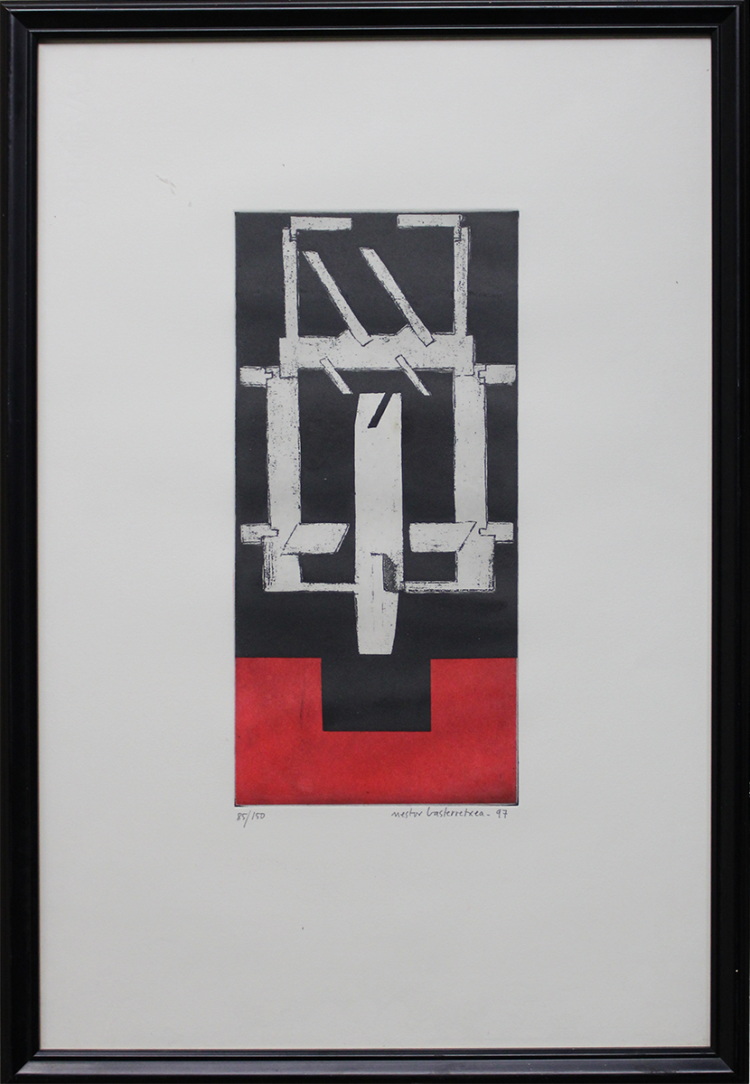 This print features a geometric composition with strong chromatic contrasts. The work presents a combination of abstract shapes in black and red. It is divided into two sections: a deep red area at the bottom and a black area at the top, above which stands out a figure that stands out against the white of the paper.