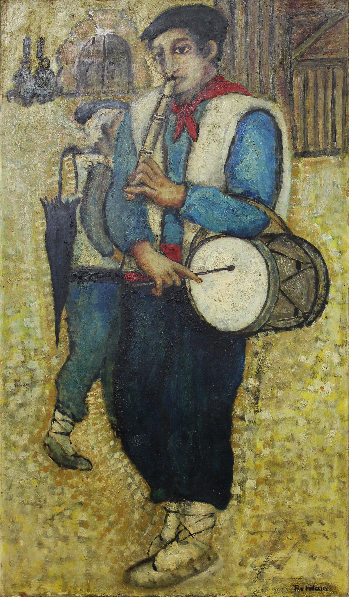 Konposizio nagusia Txistulari bat da, jantzi tradizionalarekin. Atzealdean, antzealdean pertsonai batzuk eta eraikin antzineakoak agretzen dira. Pintzelkada lodiak erabiltzen dira obra egiteko, akabera irregularra eta materikoa definitzeko. Hori kolorea nagusitu da eta kolore ilunagoetan irudikatutako pertsonaiak kontrastatzen da.