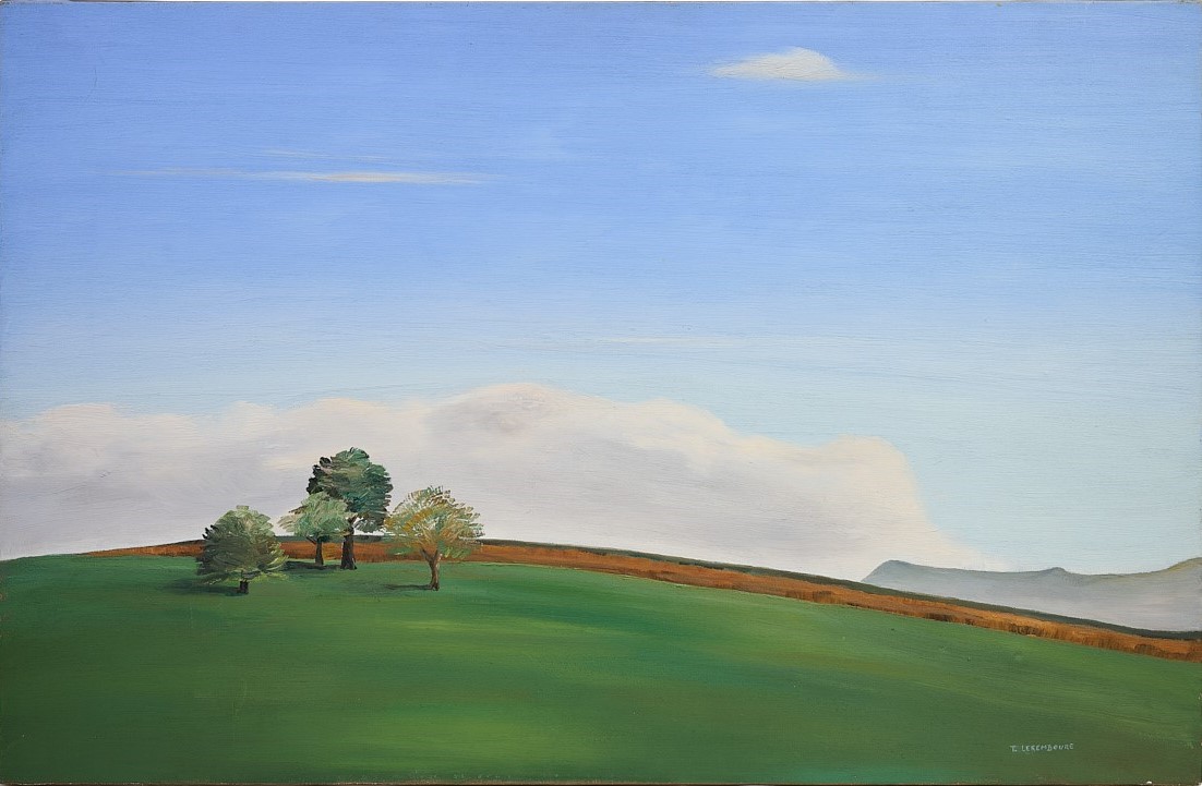 The painting is a landscape with a green hill, a small group of trees at the top, and a mountain in the background. The sky is wide and blue with a few scattered clouds. The composition is minimalist, with a use of soft, luminous colors.