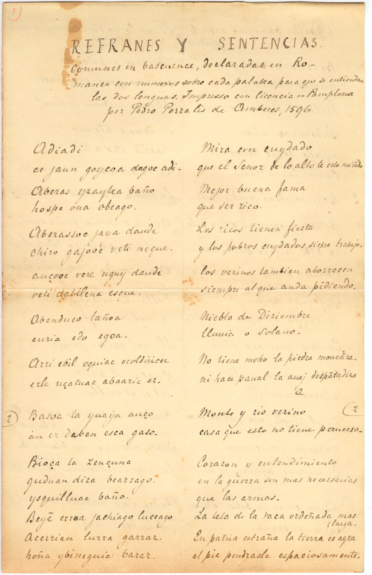 76. EYS, W. J. van - Refranes y sentencias comunes en vascuence (eskuzko kopia bi eta galeradak)