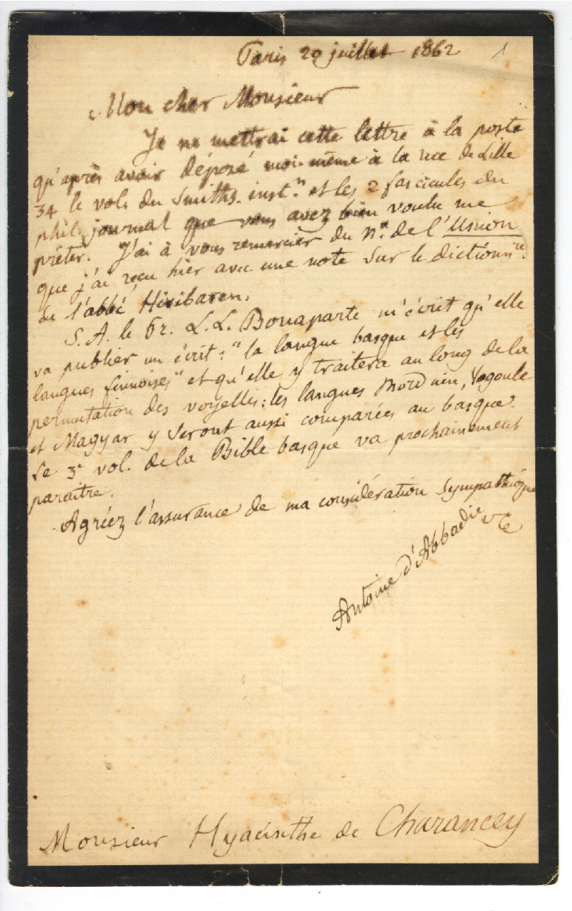 1. ABBADIE, Antoine - Hyacinthe Charencey-ri gutunak 1862-1880