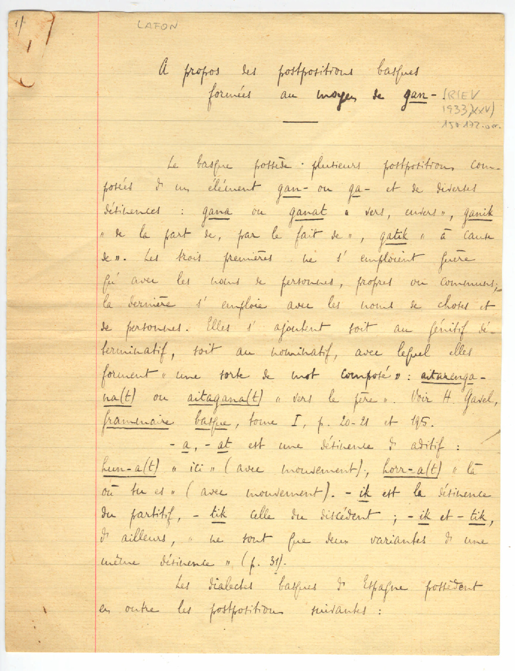 4. LAFON, René - A propos des postpositions basques formées au moyen de gan-