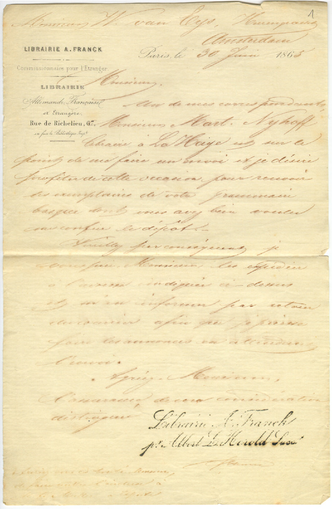10. FRANCK, Librairie A. - W.J. van Eys-i 1865-1866