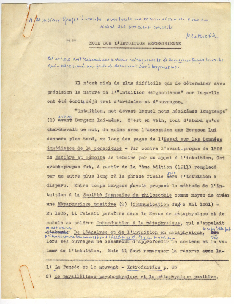 1. BASTIDE, Roger M. - Note sur l’intuition bergsonienne