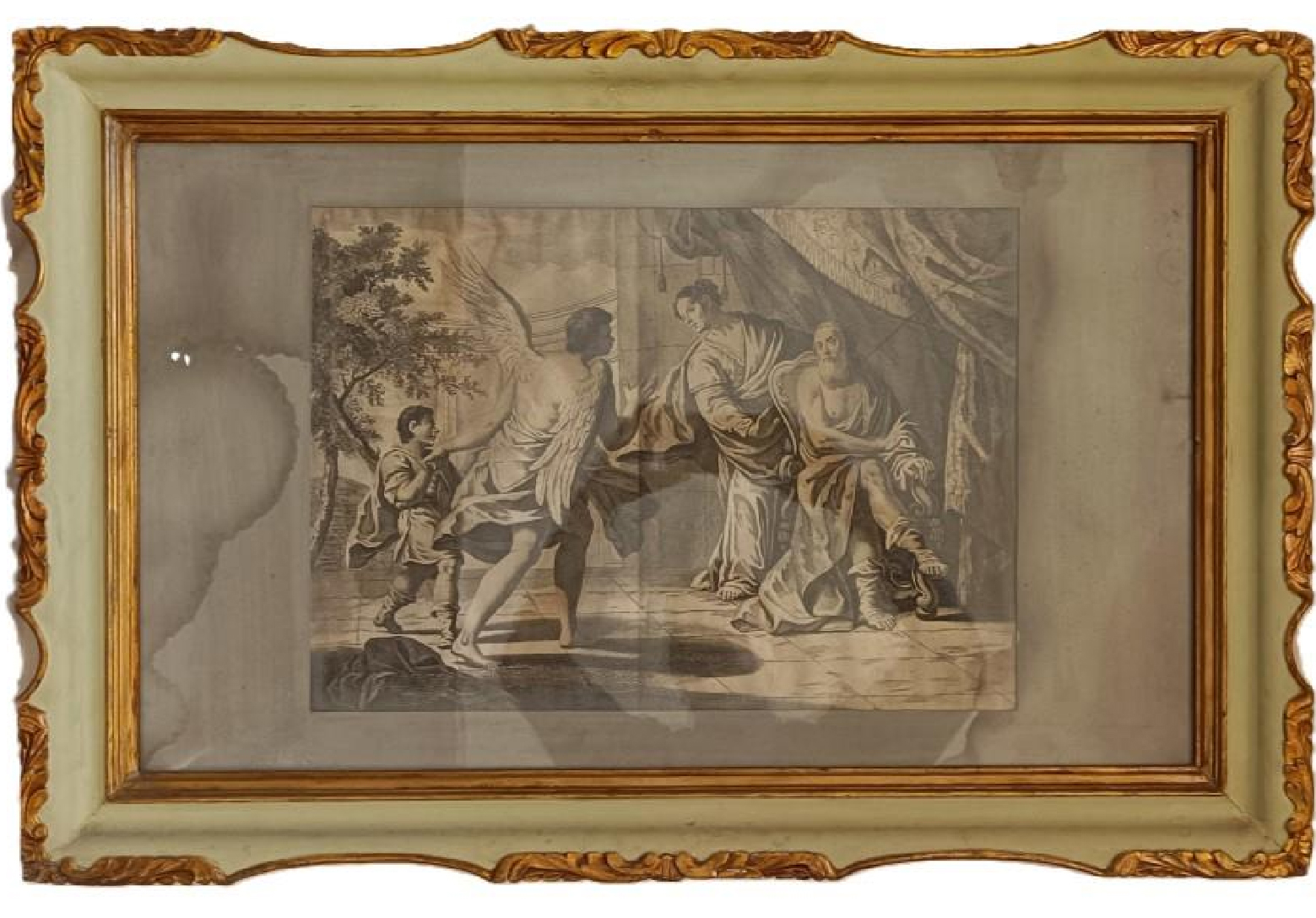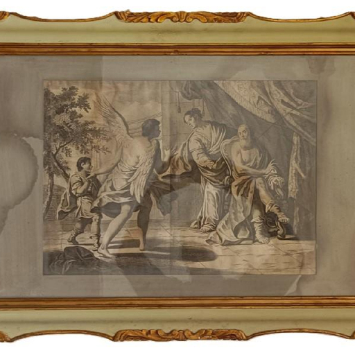Tobitek bere seme Tobiasi aholku moralak ematen dizkion pasartea erakusten du eszenak, Aingeruarekin abiatu aurretik. Justizia, behartsuekiko karitatea, Jainkoarekiko begirunea, manamenduekiko fideltasuna eta bere ekintzetan zuhurtasuna zein garrantzitsuak diren irakasten dio. Tobit eta emaztea atzealdean agertzen dira, gortina batzuen azpian, agure itxurarekin. Ezkerrean, Tobias gaztea ikusten da, Aingeruaren eskutik. Aingerua hegalekin agertzen da eta ez dago bidaiariz mozorrotuta. Paspartuak irudiaren oinean legenda zein egileen sinadurak ikustea eragozten du.