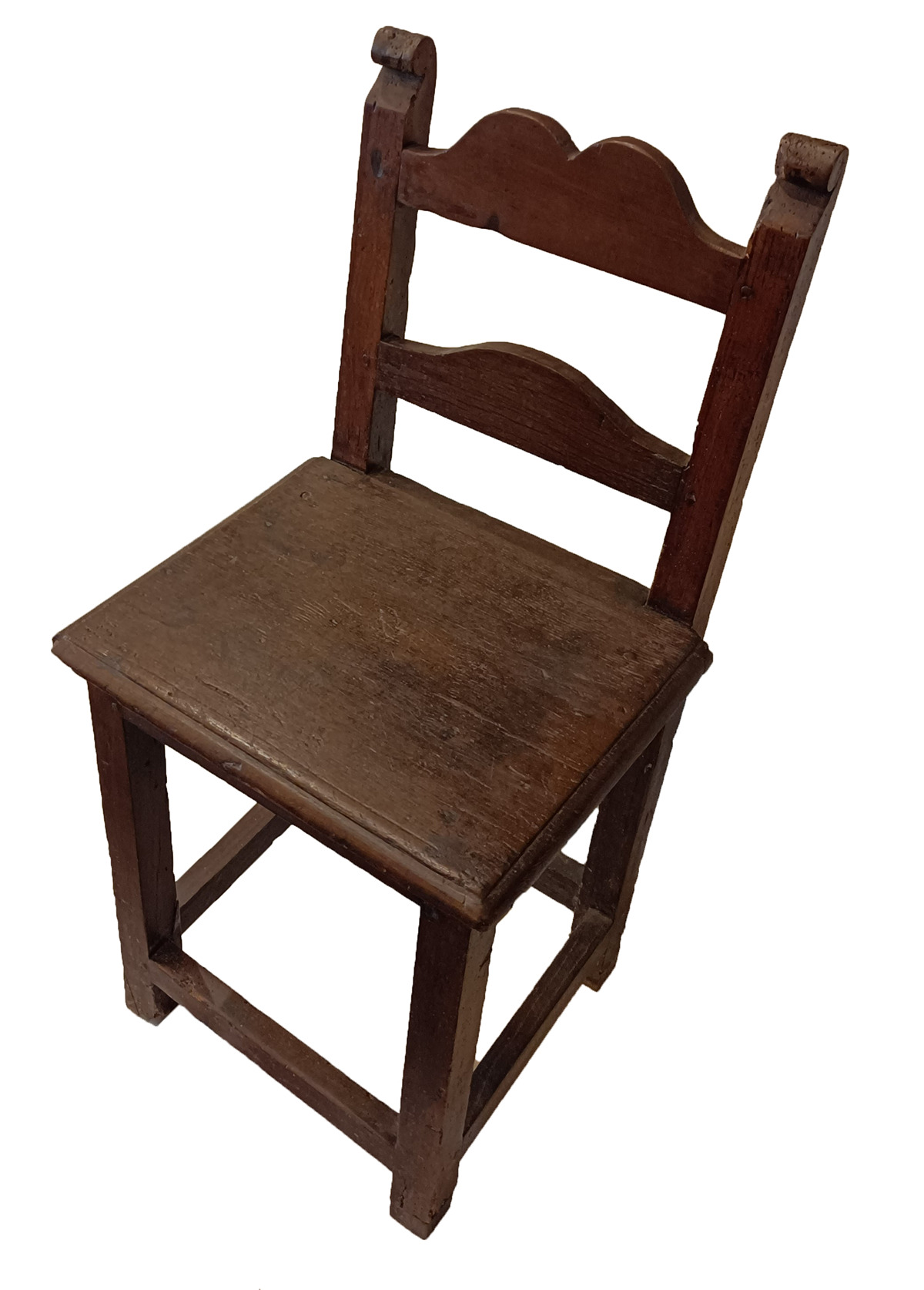 Sencilla silla de madera sin apenas decoración. Patas unidas por 4 travesaños lisos y respaldo formado por dos largueros terminados en volutas y unidos por sendos travesaños de formas abombadas
