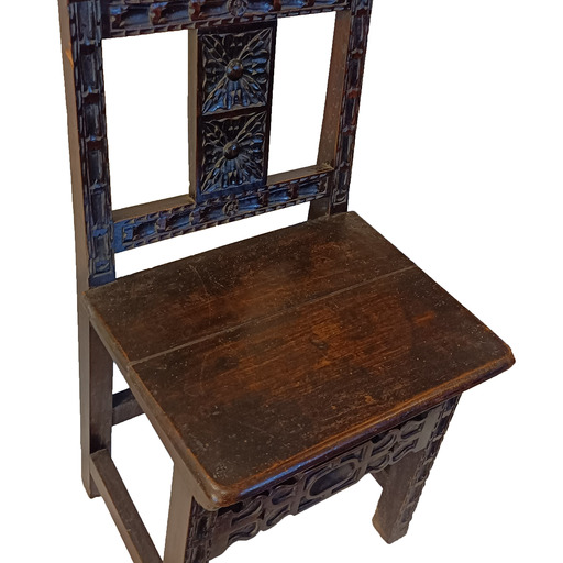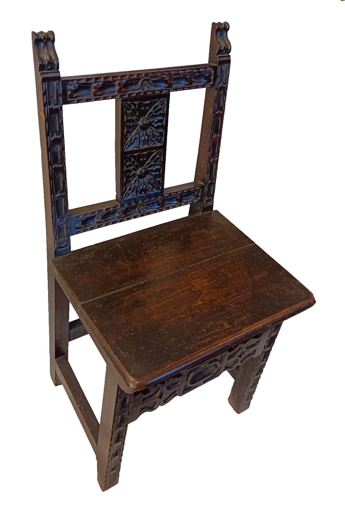 Silla de madera con patas, travesaño frontal de las patas y respaldo tallados a mano con decoración geométrica y vegetal de tradición popular vasca.