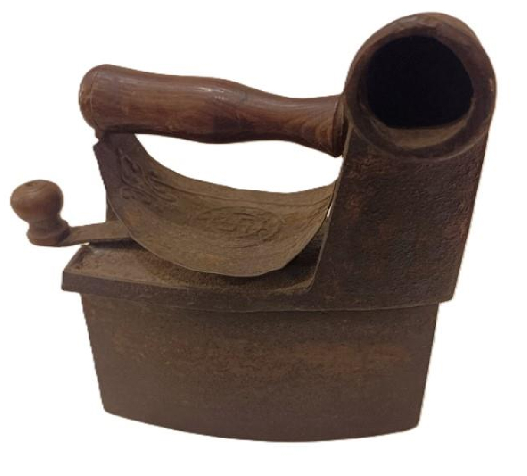 - es Plancha de carbón de hierro fundido con mango de madera.