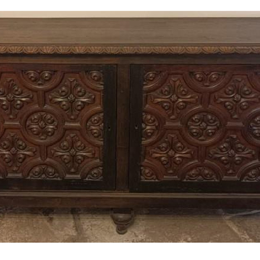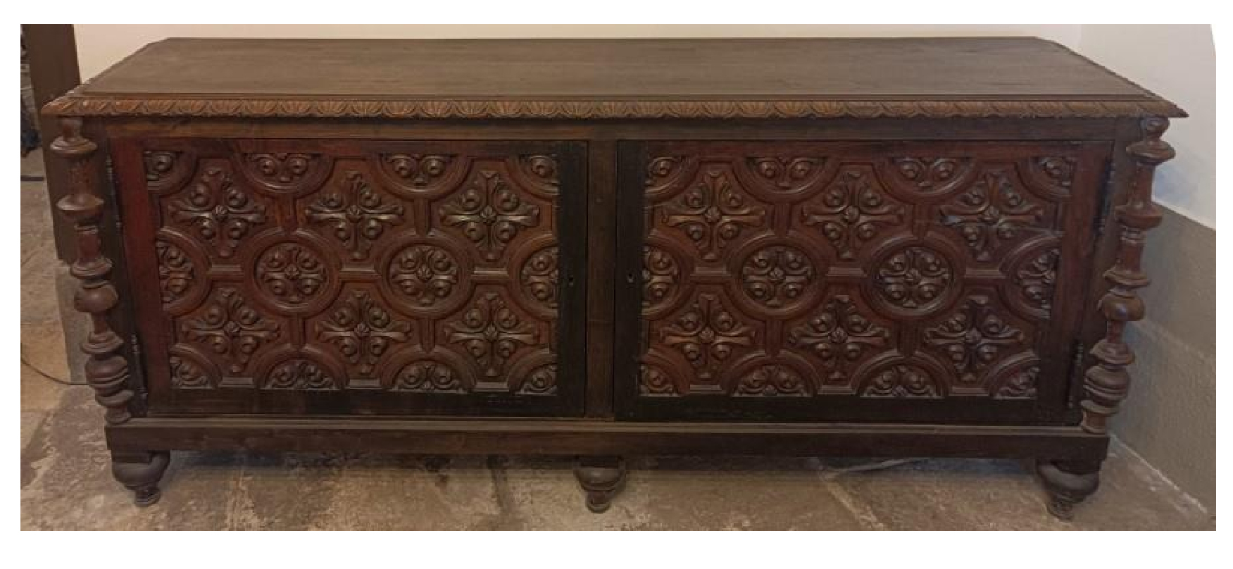 Aparador bajo de dos puertas en madera. Un estante en cada una de las dos secciones interiores, ambas con cerradura y llave conservada. Decoración a base de motivos vegetales y geométricos. Hace conjunto con un armario alto que se encuentra al fondo del portal.