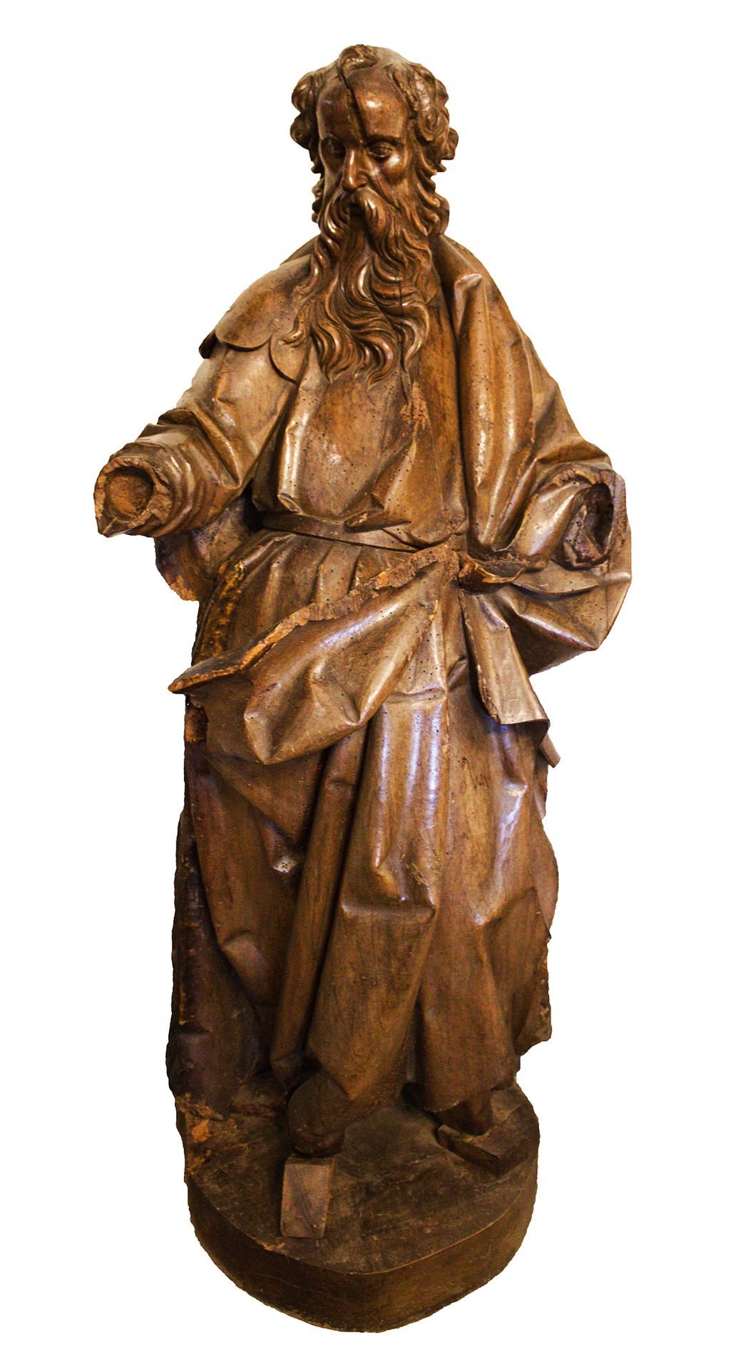 This life-size sculpture of Saint Paul, carved in walnut wood, depicts the apostle with his traditional attributes: a long, prominent beard and pronounced baldness, traits that identify him in Christian iconography. The work shows detailed work in the folds of his tunic and also in the treatment of the curls in his beard. The absence of hands makes it difficult to know what attributes he originally carried: perhaps a book or scroll (a symbol of his epistles) or a sword (a common attribute, representing his martyrdom). The noble and durable walnut wood suggests that it was an important piece, perhaps intended for an altarpiece.