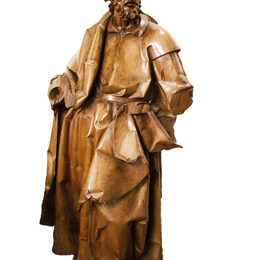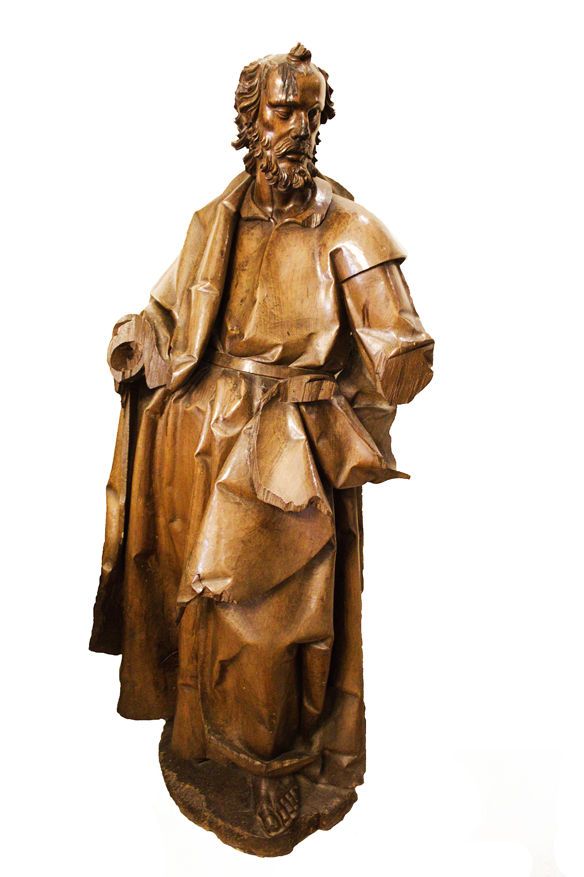 This life-size walnut sculpture of Saint Peter depicts the apostle with his classic attributes: a long, full beard, painstakingly carved into curls or locks, and abundant hair that distinguishes him from his usually bald colleague, Saint Paul. The absence of hands makes it difficult to identify the original attributes, although it is likely that he held the keys to the Kingdom of Heaven (his symbol par excellence, based on *Matthew 16:19*) or a book (an allusion to his doctrinal authority). The quality of the carving, the material, and its size suggest that the piece could have been created for a significant space, such as an altarpiece.