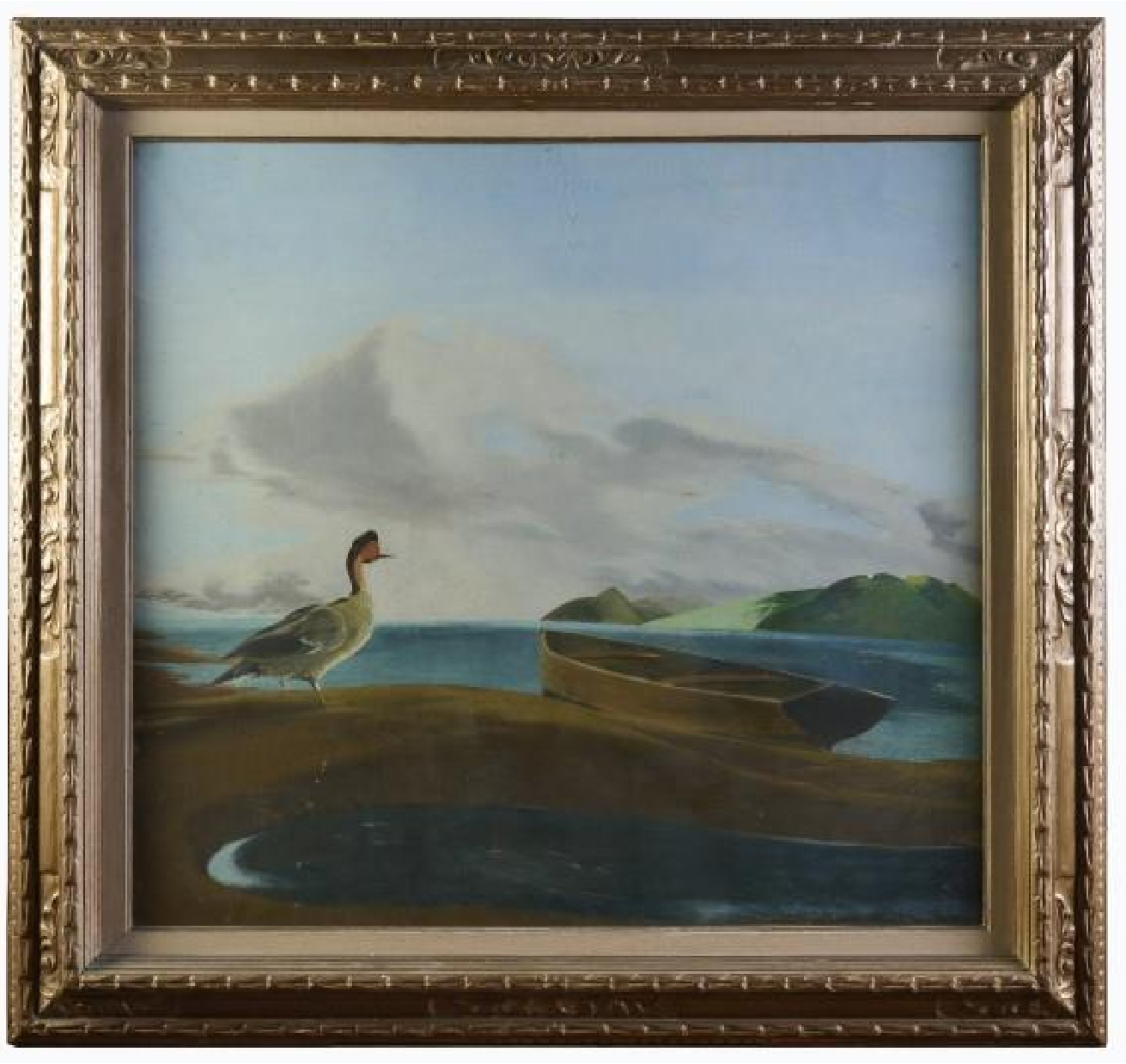 This almost square-shaped view shows a calm sea of blue hues against a background depicting a coastal profile of green mountains. In the foreground, a boat floats alone, while a goose watches it curiously, becoming the center of attention. The dim light and simple details (the abandoned boat, the watchful bird...) convey a sense of stillness and frozen time. From the shapes of the mountains in the background, we can identify that the evoked setting corresponds to Urdaibai, as seen from Busturia, the town where the artist lived and which was the setting for a significant portion of his work.