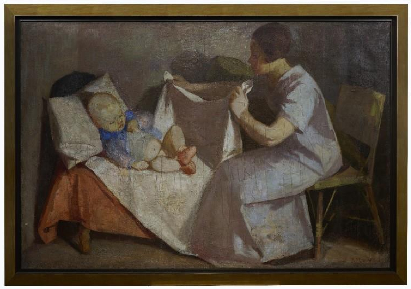Eszenan, siesta betean dagoen haurtxo bat bere amak zaintzen du. Hau, eserita dagoen aulkitik, ohe-estalki gorriaren gainean hedatuta dagoen izara zuri batekin tapatzen zaio. Haurtxoa burko baten gainean etzanda dago, gorputza apur bat altxatuta. Ezkerreko eskuarekin, bere gorputzaren goikaldea estaltzen duen jantziaren muturra hartzen du. Biluzik dago behealdean.