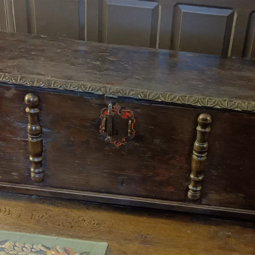 Walnut wood storage chest with hinged lid and iron lock. Keeps the key. Front decorated with 4 semi-balusters. Small compartment inside.
