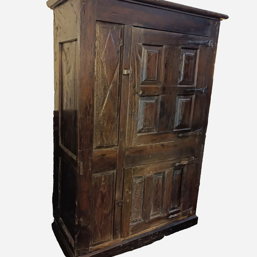 Wardrobe with two doors and two shelves inside. It has a lock on each door, which has been replaced by modern ones. Wooden pins on both doors.