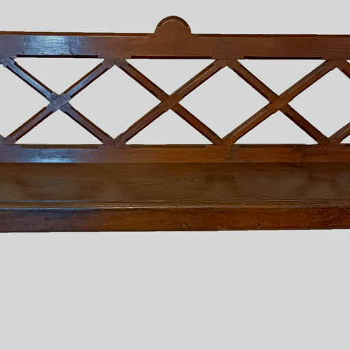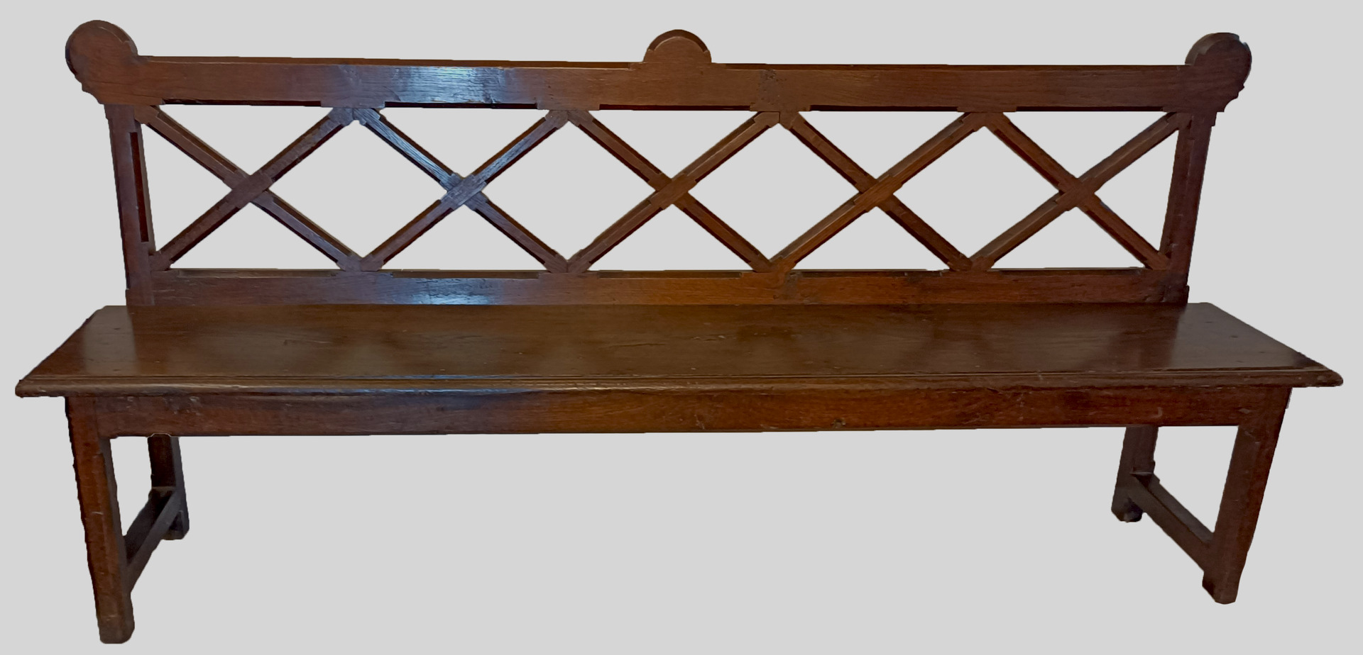 Banco de recibidor en madera de roble. Respaldo en forma de celosía a base de rombos rematado con esquinas y centro superior redondeados. Similar al banco nº30 con dimensiones ligeramente diferentes.