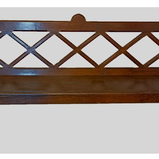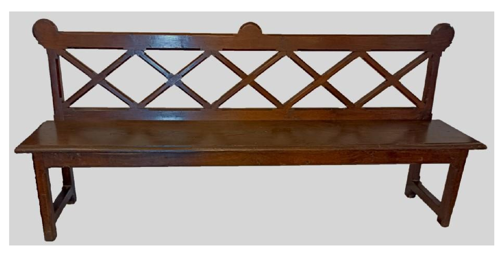 Banco de recibidor en madera de roble. Respaldo en forma de celosía a base de rombos rematado con esquinas y centro superior redondeados. Similar al banco nº 29 con dimensiones ligeramente diferentes.