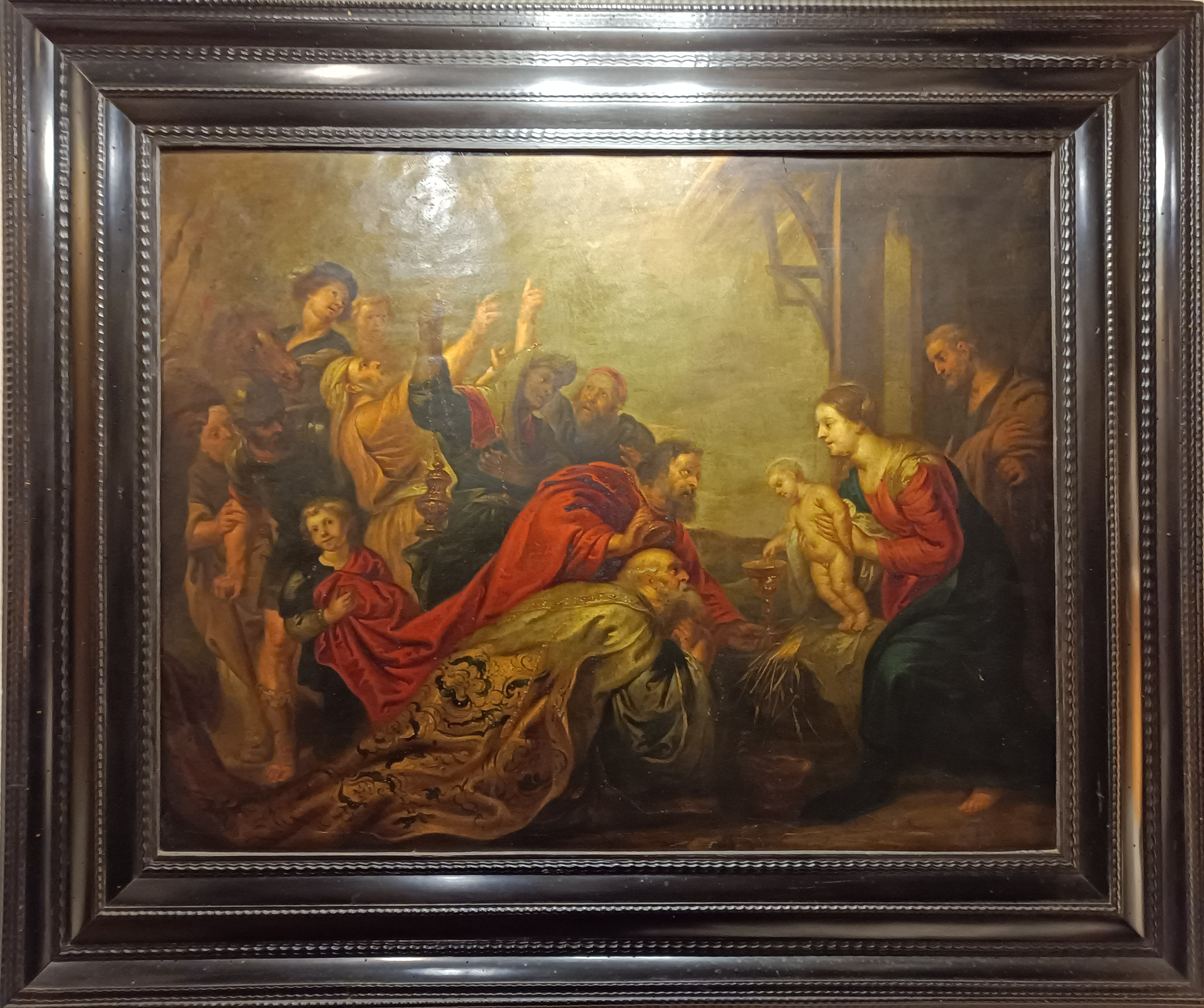 The work depicts the moment when the Three Wise Men from the East present their gifts to the newborn baby. The scene features a colorful composition of characters: in the foreground, Kings Melchior and Gaspar prostrate themselves in adoration toward the Child, who is held in Mary',s arms, while Joseph, behind her, contemplates the moment. In a slightly further back plane, Balthazar holds the censer, leading a crowd of secondary figures, some of whom point to the sky in the direction of the star that guided them to the nativity scene. The Adoration of the Magi was a frequent theme in Rubens',s work. The peculiarity of this interpretation lies in the absence of the Star of Bethlehem, which is usually shown guiding the Three Wise Men on their way to the newborn baby.