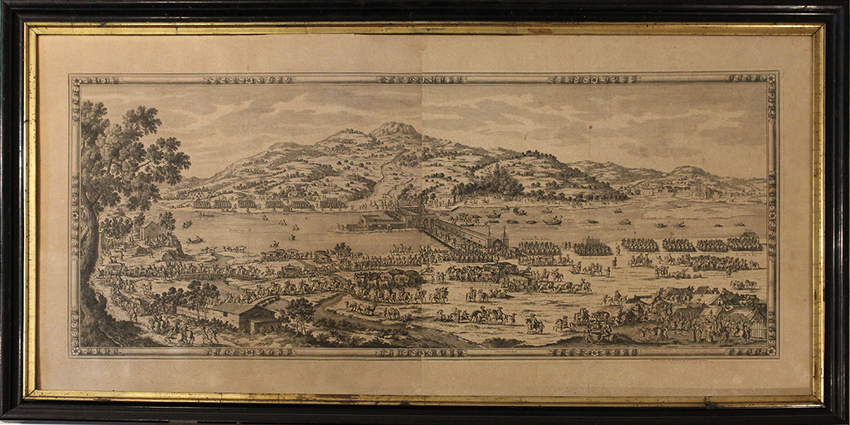 Los Faisanes Island can be seen with the Spanish armies on the Behobia side and the French armies on the French side of Hendaye. Two bridges connect the island with Spain and France, respectively. In the foreground, the French army is shown with formations in square and others in parade. In the center of the Bidasoa River is the island with the two aforementioned bridges. Boats can be seen on both sides of the island. On the French side, each group of soldiers bears its name on the lower part, as do some boats. On the Spanish side, the mountains are clearly visible, with Irún on the right.