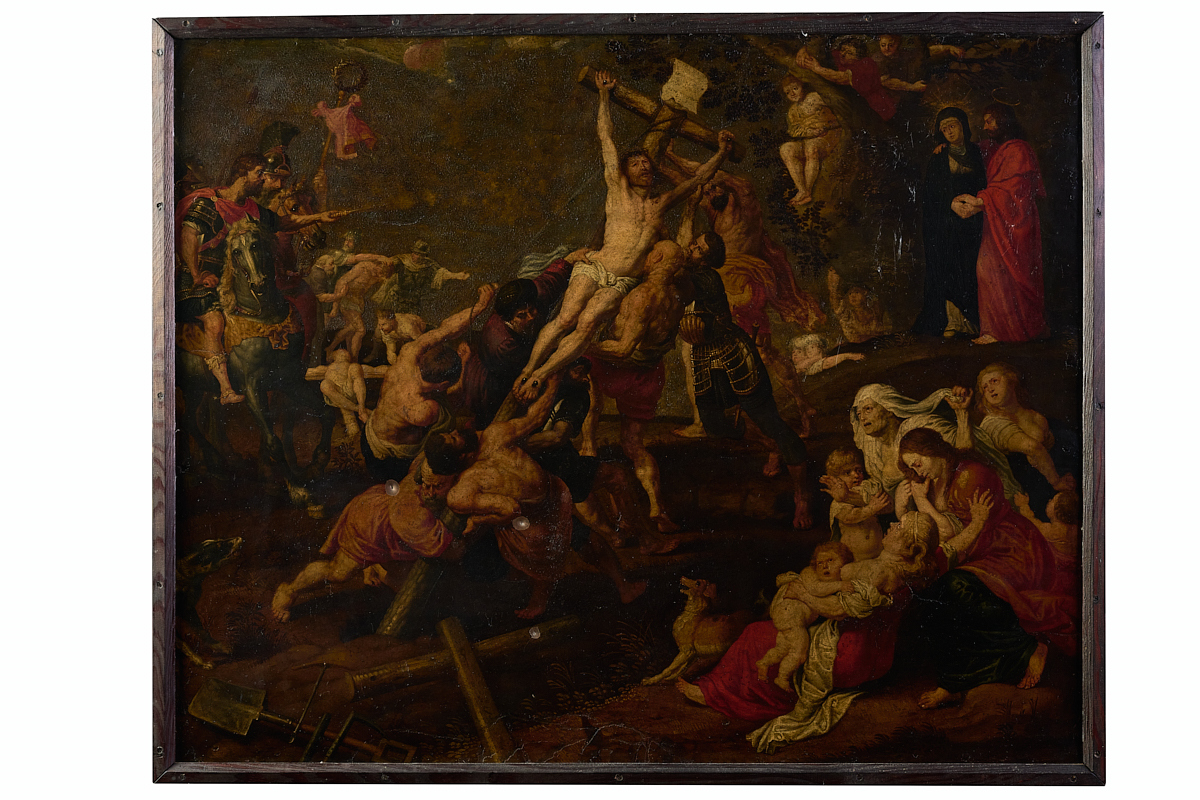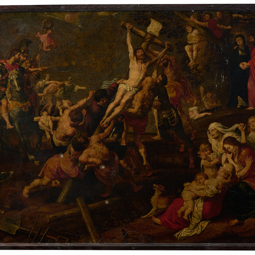 The scene shows the moment of the elevation of the cross, once the journey to Mount Calvary has been completed. Soldiers and executioners participate in the action of raising the cross, under the orders of a mounted officer (Longinus). In the background and to the right, Mary can be seen being comforted by John, while Mary Magdalene, accompanied by other women, laments in the lower right. The scene is depicted in a seemingly chaotic manner, although it is actually organized around the diagonal marked by Christ',s cross. The forced foreshortening of the executioners and executioners who raise the cross and the careful detail with which their anatomies have been represented are striking.