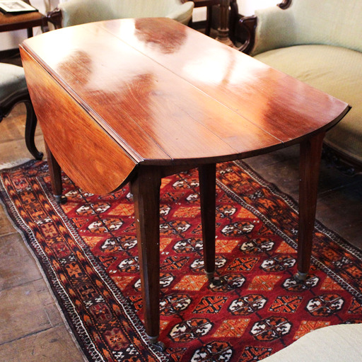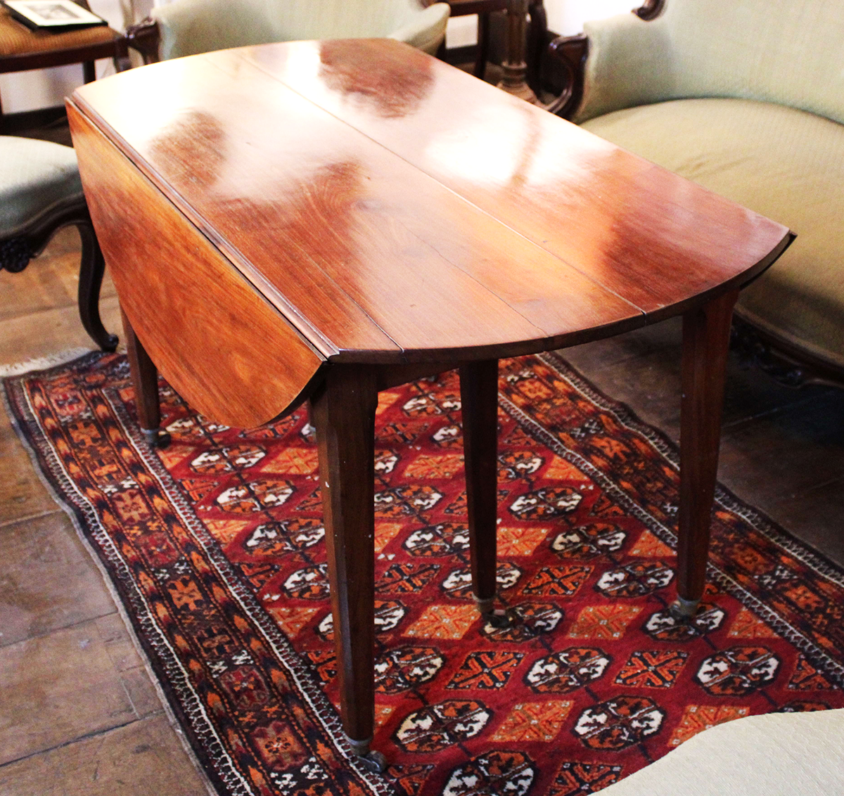 - es Mesa extensible de seis patas y un travesaño. Tiene unos tiradores que sujetan los dos tableros a los costados que forman parte de la extensión de la mesa junto con dos bisagras de metal.