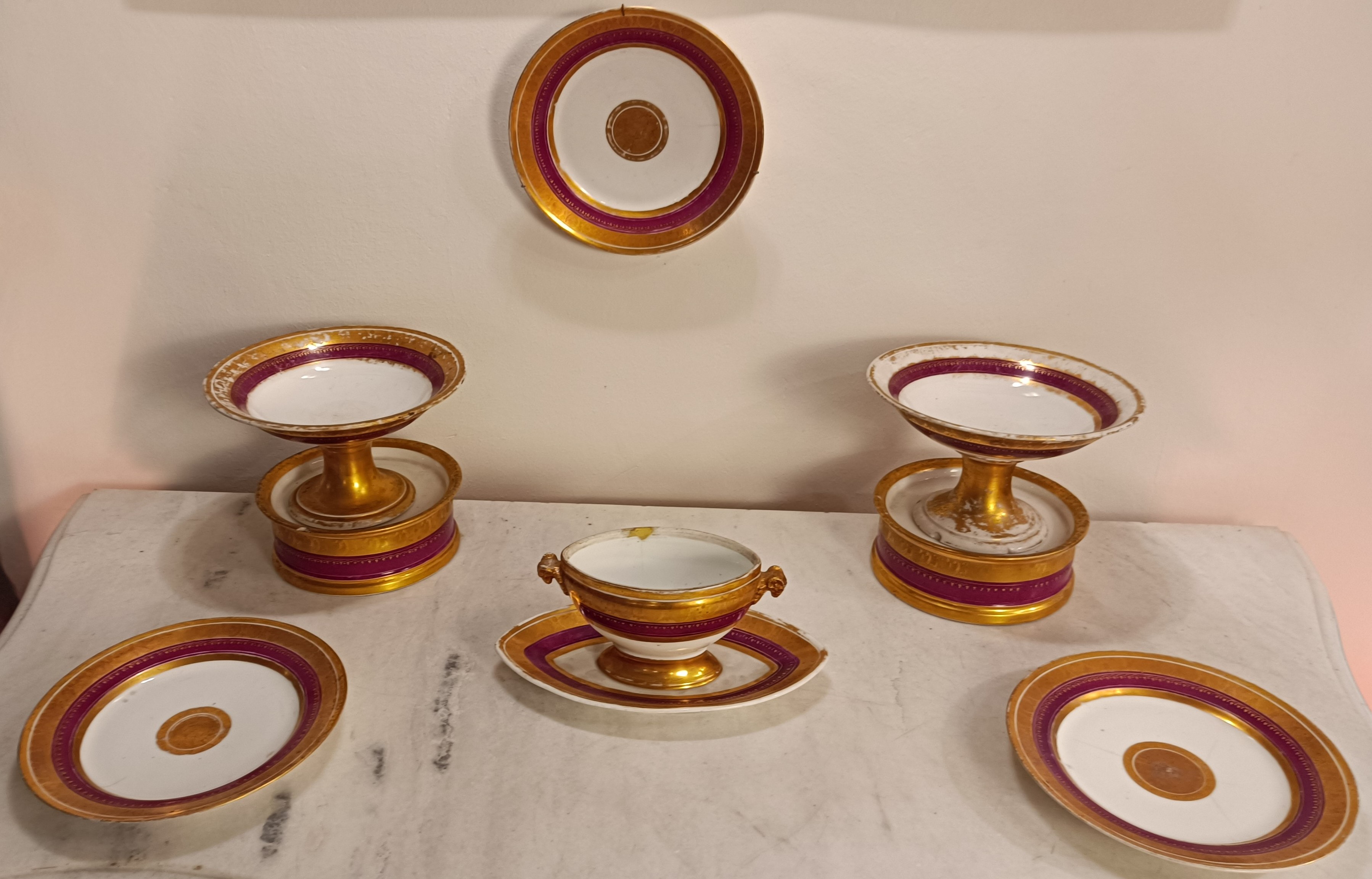 Vajilla de pocelana esmaltada compuesta por seis platos, una salsera con su plato ovalado y dos fruteros, cada uno con sobre un pedestal independiente (son 12 piezas en total). Los platos llevan la marca Schoelcher en su base. Los fruteros llevan la marca L´escalier de Cristal