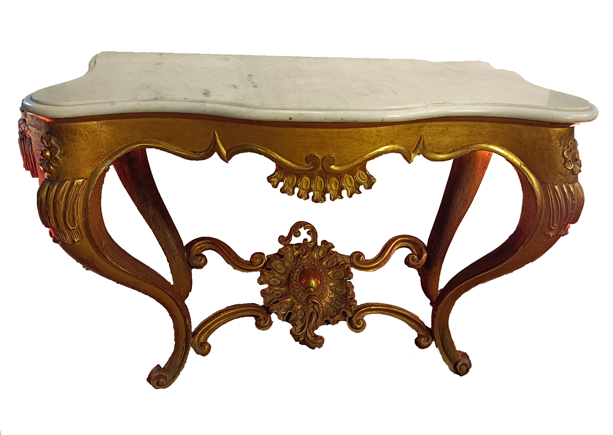 Luis XV .a estiloko kontsola-mahaia, urre koloreko egurrez egina, eta marmol zuri betodunezko taula. Forma avolutatuak ditu, bai taulan, bai kabriolet hanketan, bai beheko langetan. Landare-dekorazioa isurialdean eta langeten erdian.