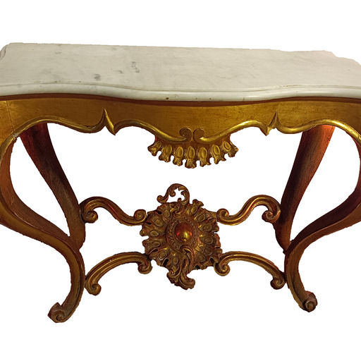 Mesa consola de estilo Luis XV en madera dorada con tablero en mármol blanco veteado. Presenta formas avolutadas, tanto en el tablero como en las patas cabriolé, así como en los travesaños inferiores. Decoración vegetal en el faldón y en el centro de los travesaños.