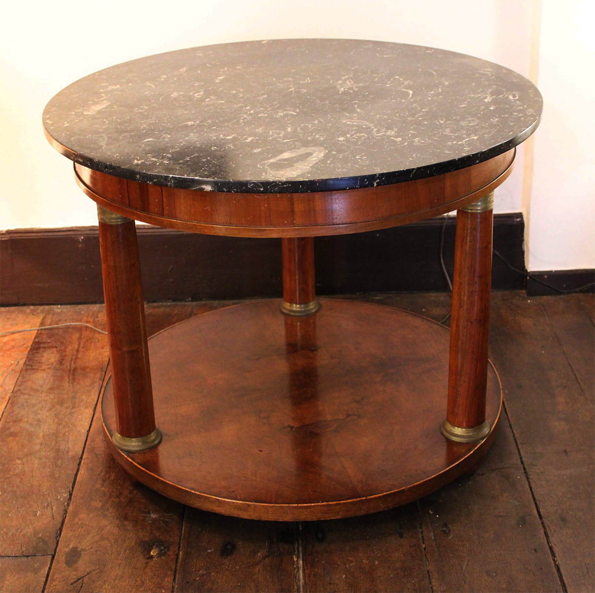 Mesa velador Imperio en madera de caoba con tapa circular de mármol gris oscuro veteado. El faldón del tablero descansa sobre tres columnas con basas y capiteles en metal, que reposan a su vez sobre una estructura de forma triangular que las une.