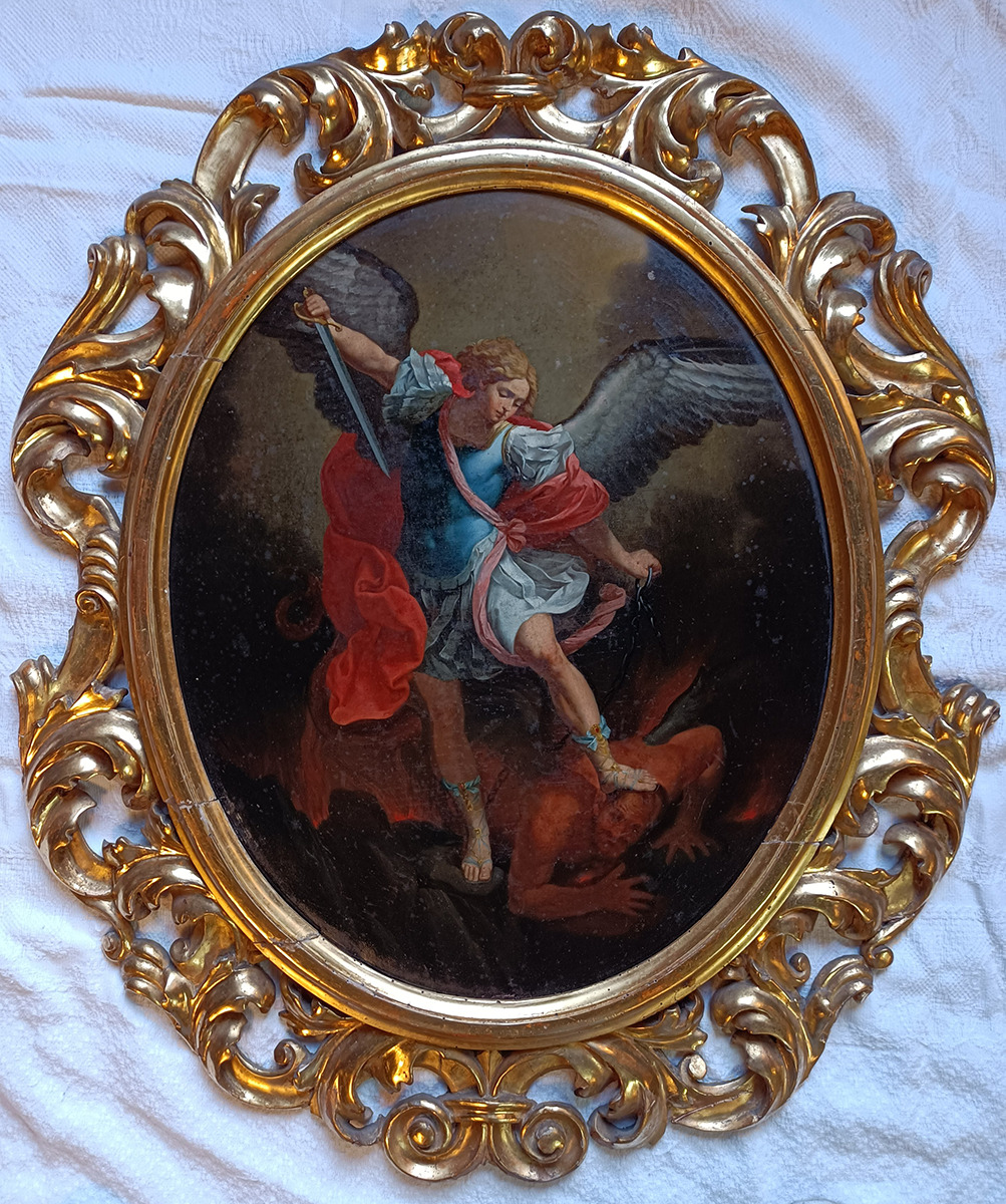 In the scene, we see Saint Michael, wearing a Roman-style armor, attacking Satan, who has been defeated. The archangel is depicted with Reni',s typical idealized beauty, while Satan is portrayed with a grotesque air. The painting is oval in shape and framed in a gilded wooden moulding of plant carvings.