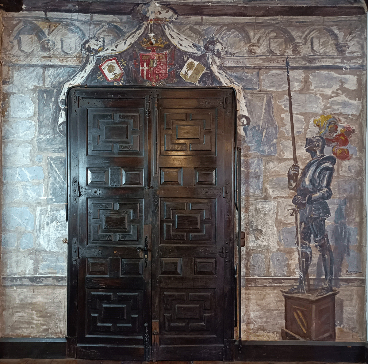 A trompe-l',oeil by the painter Pablo Uranga decorates the walls around the entrance door to the main hall on the first floor of the tower, on its interior side. The trompe-l',oeil creates the illusion of a stone wall of fine ashlar, topped at the top by a frieze formed by six small arches resting on brackets. Inside each arch, an undefined heraldic coat of arms is simulated. References to different family names have been inscribed in red on the band that delimits the arches at the bottom, each one below one of the coats of arms. Half-open curtains falling from above the door and along its sides reveal three other family coats of arms, in this case colored. The largest, central one bears a marquis',s crown and banners at its sides. The trompe-l',oeil is completed with the illusion of a medieval suit of armor holding a lance, painted on the right side of the door. It stands on a pedestal drawn in perspective. The artist',s signature can be seen next to the left leg of the armor, on its lower part, and to the right of it.