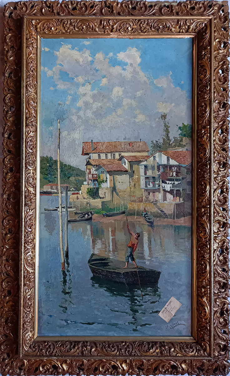 Escena portuaria en la que un personaje, en primer plano, gobierna una pequeña barca desde la popa. Se ve al fondo el puerto de Pasajes de San Pedro, con las casas de los pescadores y algunos botes varados en la orilla.