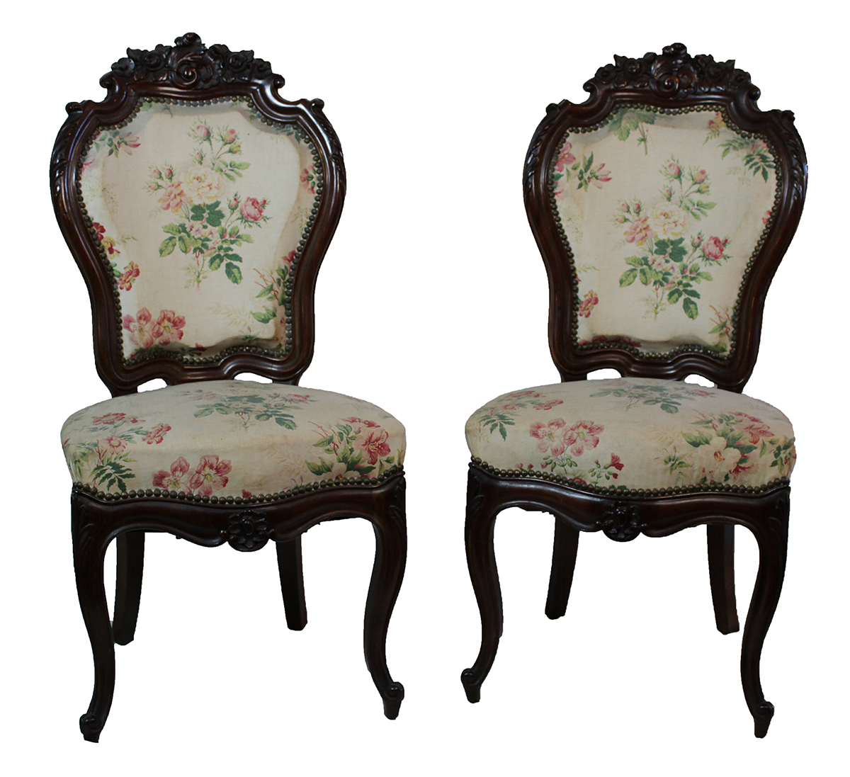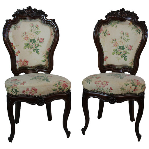 - eu Isabeldar estiloko aulki parea zur landuan. Tapizatutako eserlekua eta bizkarraldea.