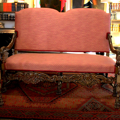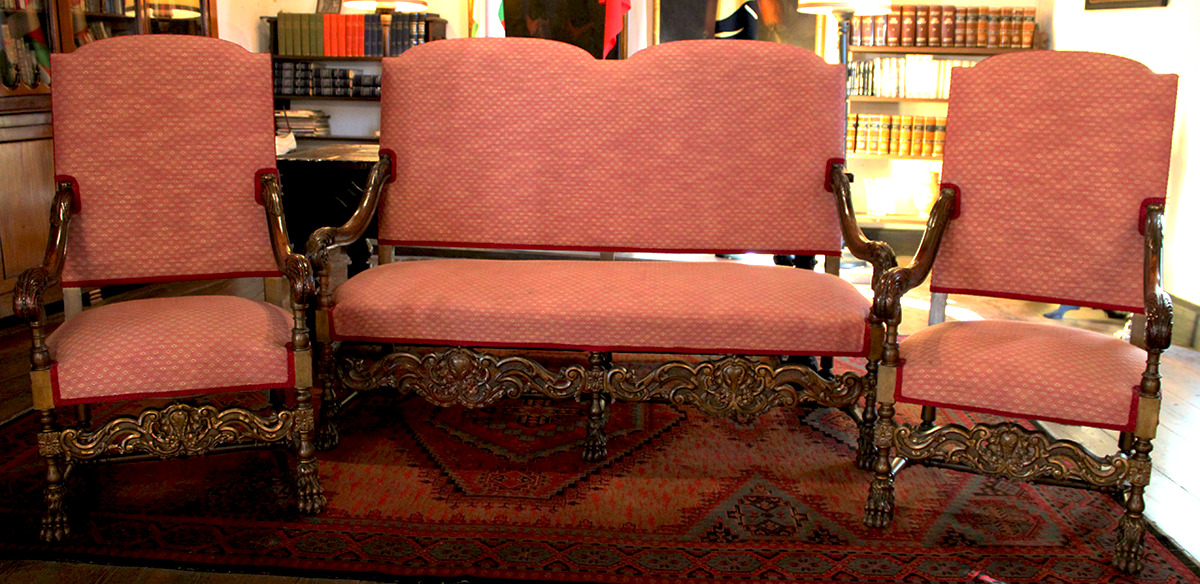 Bi plazako sofa batez eta Luis XIV .a estiloko bi besaulkiez osatuta dago. Nabarmentzekoa da beheko isurialdeko landare-motiboak zizelkatzeko lana, baita lehoiaren atzaparrez errematatutako hankak ere. Multzoa oihal arrosaz estalita dago.