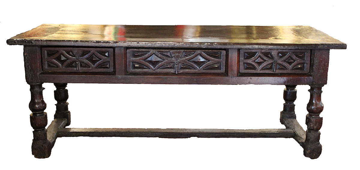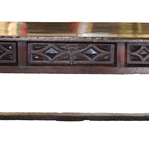 Antigua mesa castellana de refectorio de tres cajones en madera de nogal tallada. El frontal de los cajones presenta decoración de tallas geométricas (rombos). Tiene cuatro patas en forma de balaustres unidas entre sí por un travesaño en forma de H.