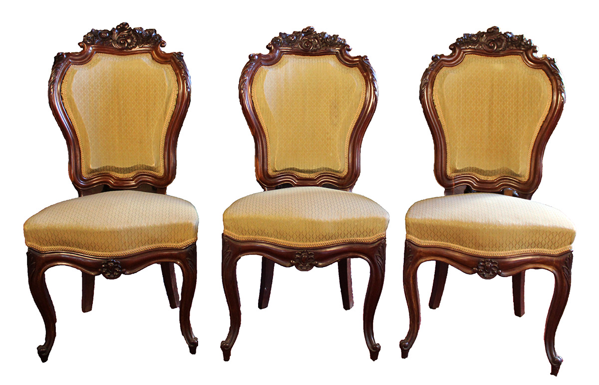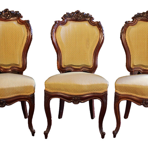 Conjunto de tres sillas de comedor isabelinas realizadas en madera tallada y tapizadas en tono amarillo claro.