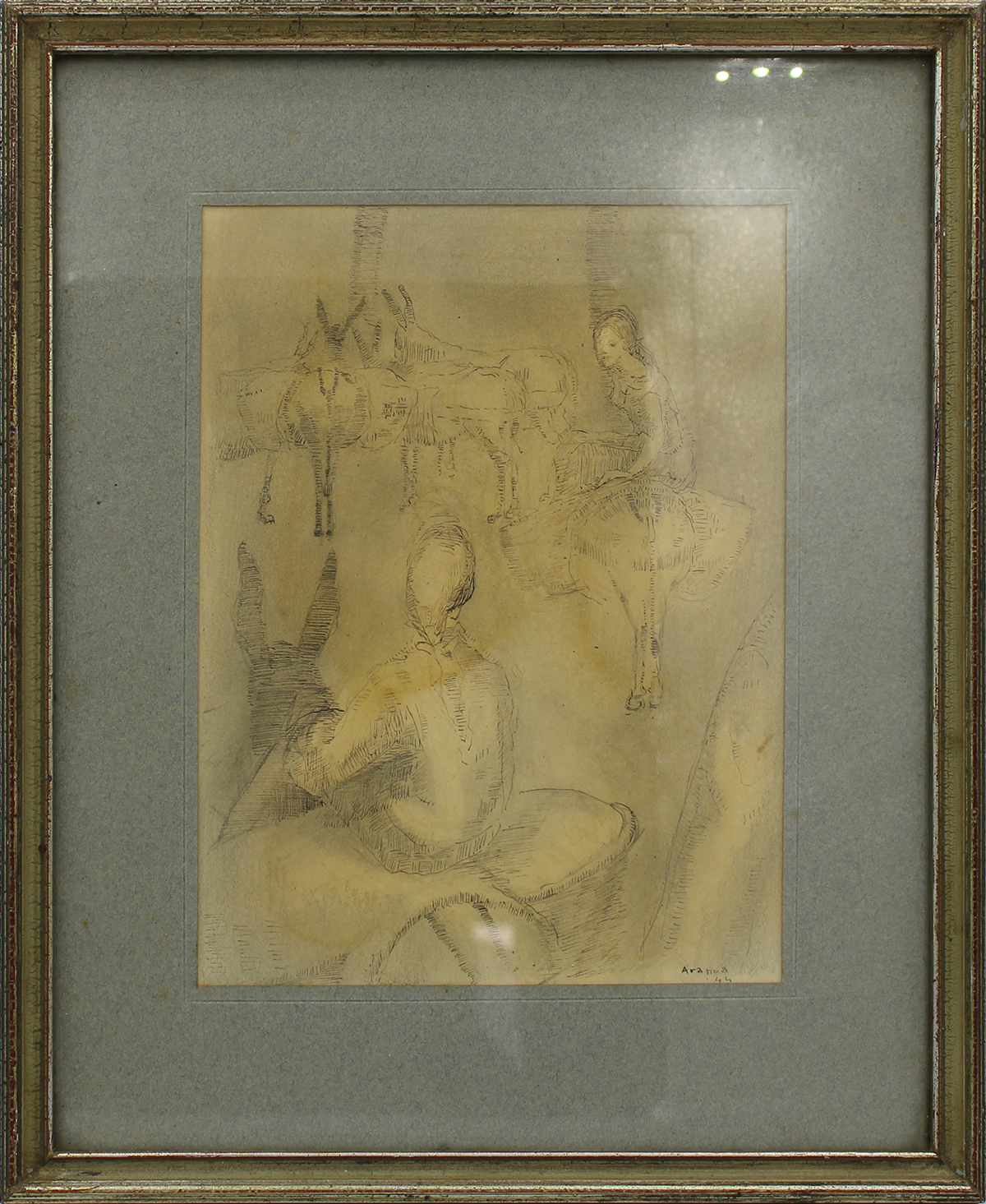 Eszena lasaia eta egunerokoa irudatzea dago landa ingurunean. Bi gizaki animalien gainean dikusten dira. Atzealdean, asto talde bat dago gizakiekin batera.
