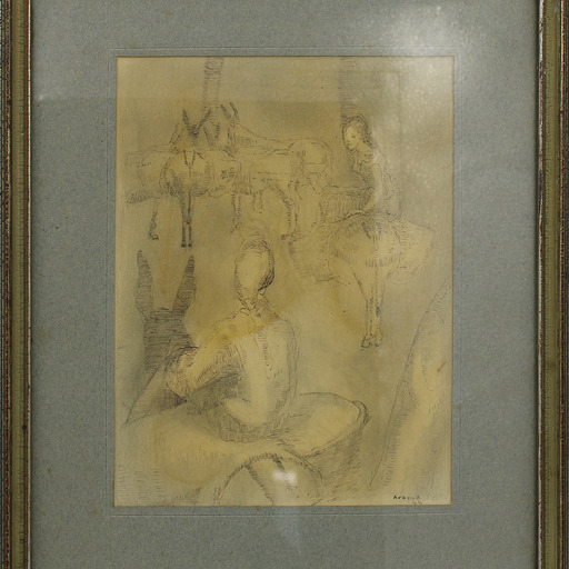 Escena que representa una composición serena y cotidiana en un entorno rural. Se aprecian dos figuras humanas situadas sobre los animales con un fondo compuesto por un grupo de burros que acompañan a las personas.