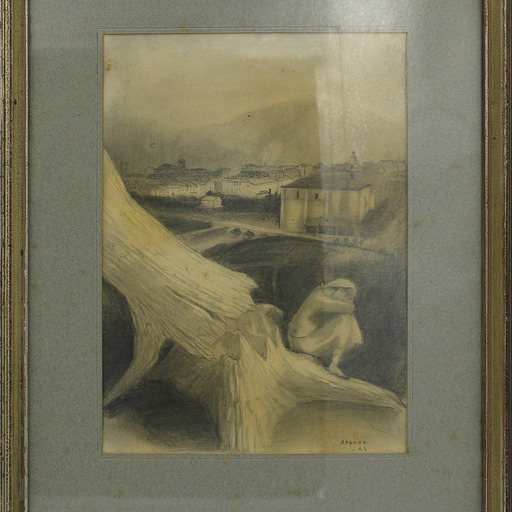 Lehen planoan, figura bakartia enbor urratu baten gainean agertzen da. Gizakia uzkurtuta dago burua belaunen gainean jarrita. Atzeko planoan pasaia dago bide batekin eraikin multzo baterantz, haien artean, eliza bat bereizten da.