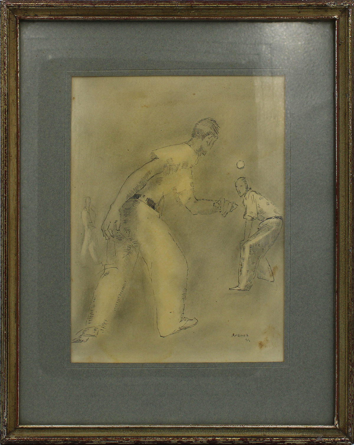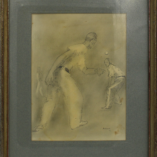 Aranoaren marrazki honetan esku pilotako bi pilotari agertzen zaizkigu. Gizona, lehen planoan, bizkarrez, sakea egitera doa, eta lehiakidea, harengana itzulita, zain dago erantzuteko. Modu tradizionalean jantzita daude, zuriz eta gerrikoarekin. Atzealdean dagoen hirugarren pertsonai batek jokoa ikusten du. Eszena beheko eskuineko izkinan dago sinatuta eta data jarrita