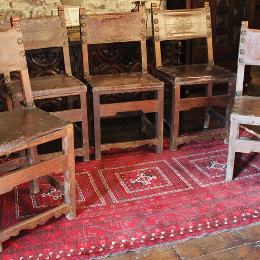 A set of five rustic chairs. The legs are joined by smooth crossbars and the backrest is made up of two stiles with scrolled ends. The seat and back are made of leather.