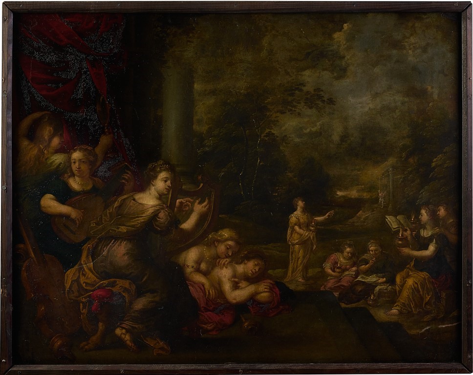 The scene represents the parable of the Ten Virgins (or the foolish and wise virgins), described in the Gospel of Saint Matthew. On the left side of the scene, and slightly further forward, the five foolish virgins are engaged in pleasure, music, vanity (a woman with a mirror), or simply sleeping lazily. Their lamps are unlit. On the right and slightly further back, however, the five wise virgins, with their lamps lit as they await their husbands, are engaged in reading and prayer, or are in a waiting attitude. The scene takes place against an idealized landscape background with a very classical feel, with columns, curtains, etc.
