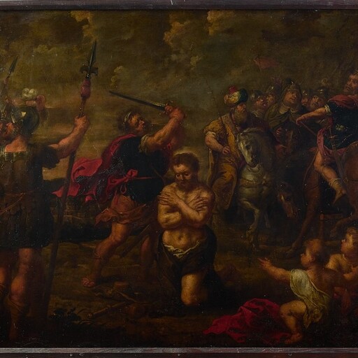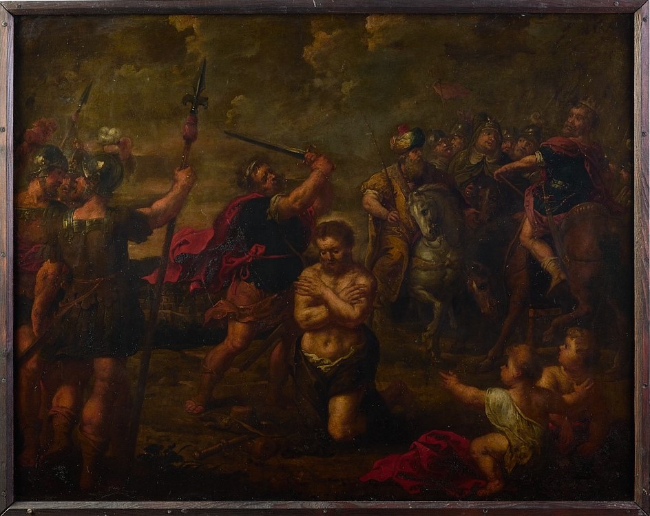 The scene depicts the moment of the martyrdom of James by order of King Herod Agrippa I (Acts 12:1-2). The central focus of the composition is the figure of the apostle, who, with his gaze lowered and his arms crossed over his bare chest, peacefully accepts his fate. The executioner has already raised the sword with which he will end the saint',s life. On the left side, three soldiers appear to be conversing among themselves. In the background, on the right, various figures can be seen on horseback, among them the crowned figure of King Herod Agrippa.